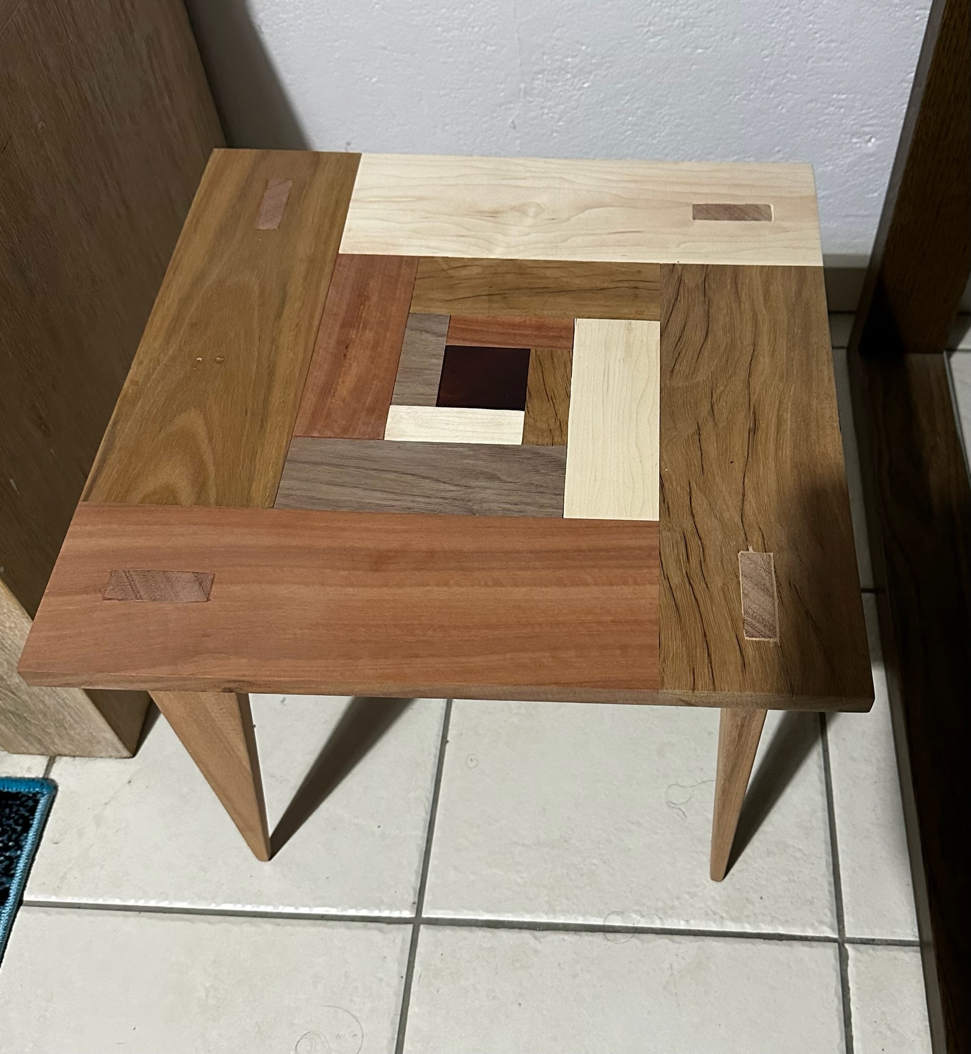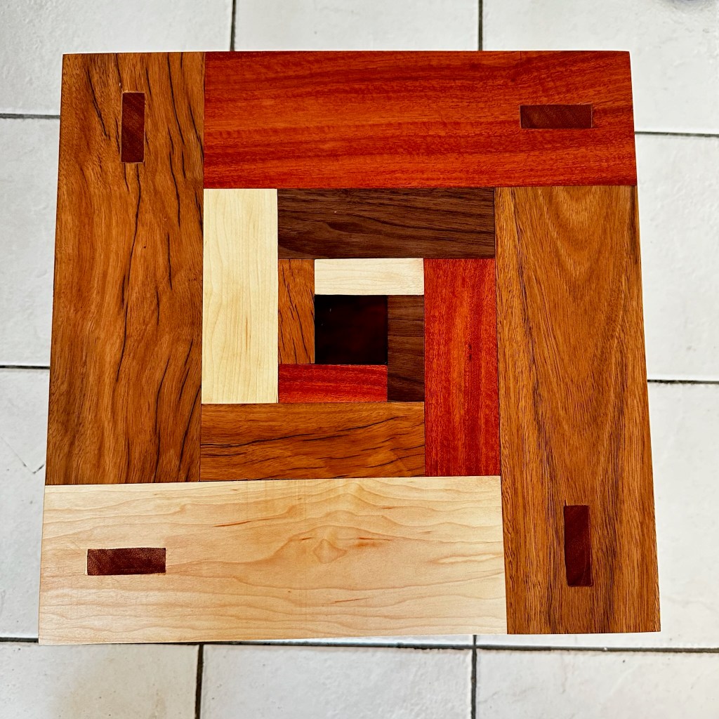 Since then I’ve participated in a furniture workshop in which I’ve built a small side table. I have learned that you can’t enclose wood as it needs space to move- that is expand when it needs to, so to carry out my design I had to learn parquetry. The piece in the middle of the table top, is glass. The difference in colour between the two images is due to the finishing touch which is coating. I would have a photo of the whole finished table when I get around to coating the legs.