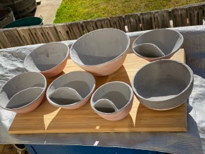 Next week is my first reduction firing after almost 3 years. I hope I still remember how to do it….. For those of you who are not potters reduction firing means you deprive the kiln of oxygen while firing so that the charachter of the glaze and the clay change as a result. I really love the affects of reduction firing but they are very difficult to control. Maybe that is why I like it. Control is not my thing…..